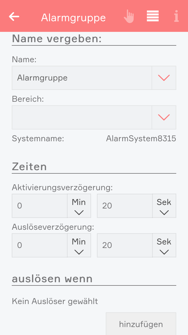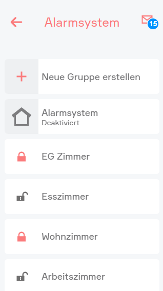 Mit der App “Alarmsystem” können Sie eine persönliches Alarmsystem für Ihr evon Smart Home erstellen. Das Alarmsystem ist unterteilt in ein zentrales Alarmsystem und einer oder mehreren Alarmgruppen. Mit Alarmgruppen wird das Alarmsystem in mehrere Bereiche unterteilt.