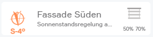 Das Object Panel der Fassade zeigt die eingestellte Himmelsrichtung. Das Symbol leuchtet orange, sobald die Fassade von der Sonne bestrahlt ist. Auf der rechten Seite wird der aktuelle Zustand der Beschattungselemente dargestellt. Ist die Fassade deaktiviert, so ist das gesamt Panel ausgegraut.