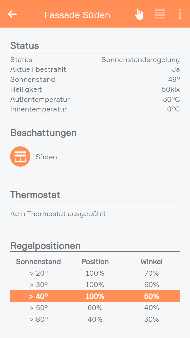 Im Operator Panel einer Fassade werden Ihnen die wichtigsten Infos zu dieser angezeigt. Neben dem Bestrahlungszustand und der aktueller Sonnenhöhe, finden Sie hier die Helligkeit und Außentemperatur, welche von Ihrer Wetterstation erfasst werden, sowie die Innentemperatur.