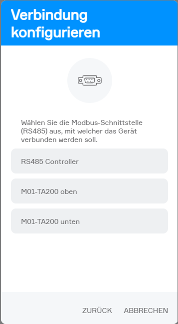 Start des Salzelektrolyseanlagen-Wizards nachdem Salzelektrolyseanlage im Pool-Wizard ausgewählt wurde. In diesem Schritt ist die Schnittstelle, an die die Salzelektrolyseanlage angeschlossen ist, auszuwählen.