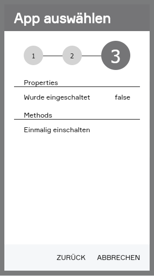 Mit "App auswählen" wird ein Wizard geöffnet welcher die Verfügbaren Werte und Methoden anzeigt und ausgewählte hinzufügt. Alternativ können Werte und Methoden auch manuell angelegt werden indem Sie auf "Neue Methode hinzufügen" oder "Neuen Wert hinzufügen" klicken.