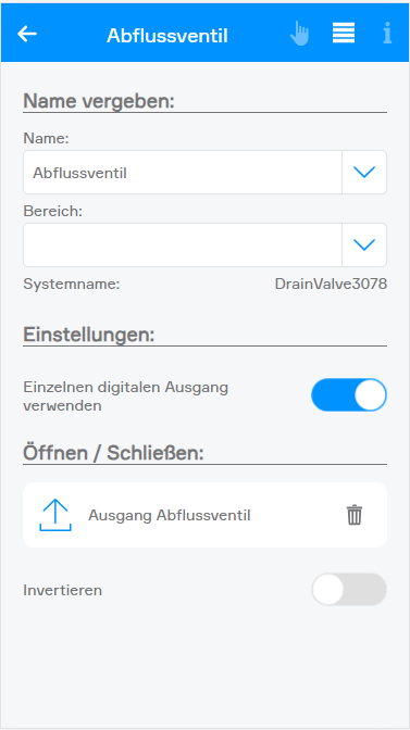 Im Parameter Panel kann ein digitaler Ausgang für das Öffnen und Schließen des Abflussventils verknüpft und bei Bedarf auch invertiert werden.