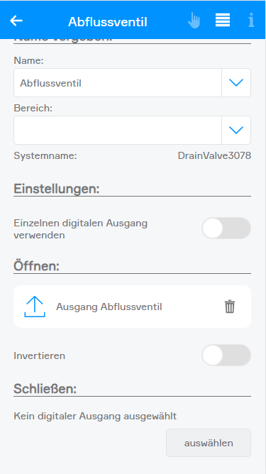 Im Parameter Panel kann ein digitaler Ausgang für das Öffnen und Schließen des Abflussventils verknüpft und bei Bedarf auch invertiert werden.