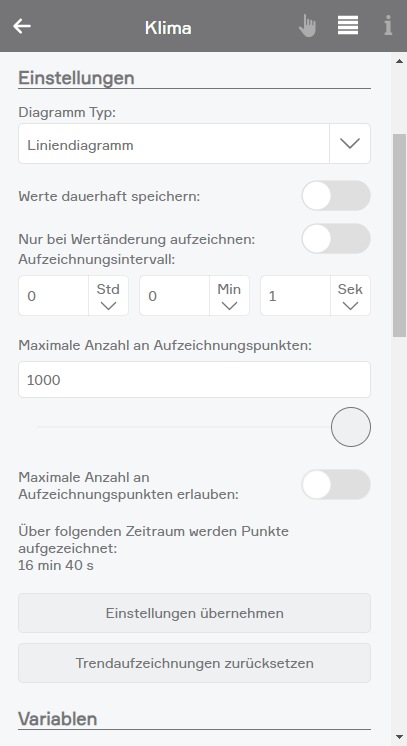 Im Parameter Panel kann für die drei Betriebsmodi eine Solltemperatur gewählt werden. Dabei kann ein Fixwert bestimmt oder ein im System vorhandener Nummernwert verknüpft werden.