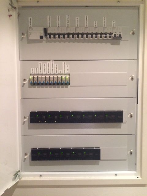 Je nach Platzbedarf und räumlichen Gegebenheiten können Sie alles in einem zentralen Schaltschrank unterbringen oder auch auf Subverteiler aufteilen. Meist ist es sinnvoll, das Untergeschoss, Erdgeschoss und den Außenbereich in einem Verteiler zusammenzuführen, wogegen die Elektrik für das Obergeschoss in einem kleineren Subverteiler im ersten Stock untergebracht wird. Mit Subverteiler können die benötigten Kabellängen und damit der Verkabelungsaufwand stark reduziert werden, auch das Einziehen der Kabel wird vereinfacht.