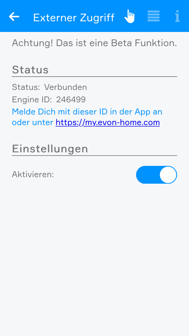 ACHTUNG! Zum Verbinden mit Husqvarna muss der externe Zugriff aktiviert sein ("Einstellungen" > "Externer Zugriff"). Dieser wird nur einmalig während der Anmeldung benötigt und kann danach gegebenenfalls wieder deaktiviert werden.
