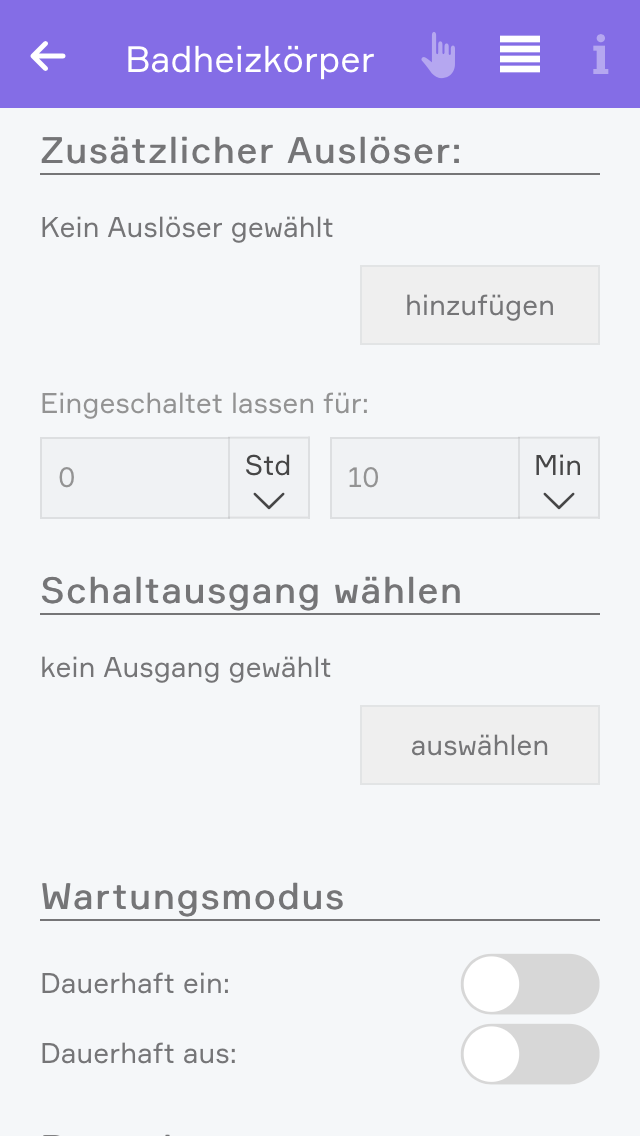- 1x 2-fach Taster hinter dem Bett für Sonderfunktionen, diese könnten normalerweise über Doppelklick oder langen Tastendruck abgehandelt werden und sind nur in unserem Beispiel, um das evon Smart Home Digitalmodul D1180 zu demonstrieren.