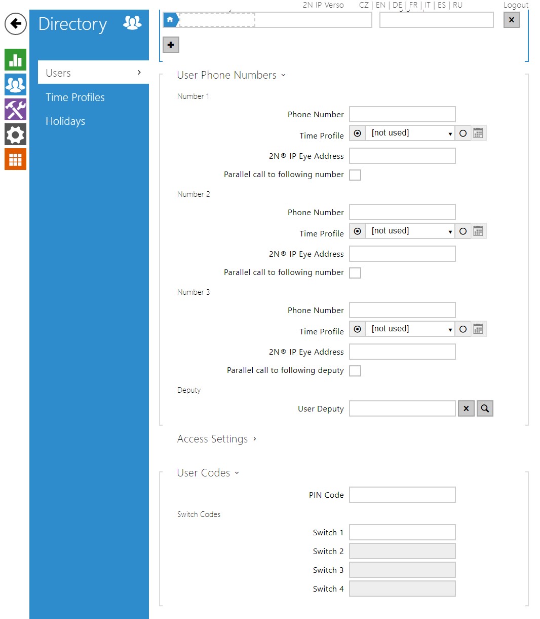 Soll die Tür über einen PIN Code geöffnet werden, kann dieser unter "Directory" > "Users" im entsprechenden Benutzer unter "User Codes" > "PIN Code" angelegt werden.
