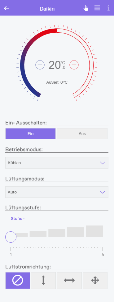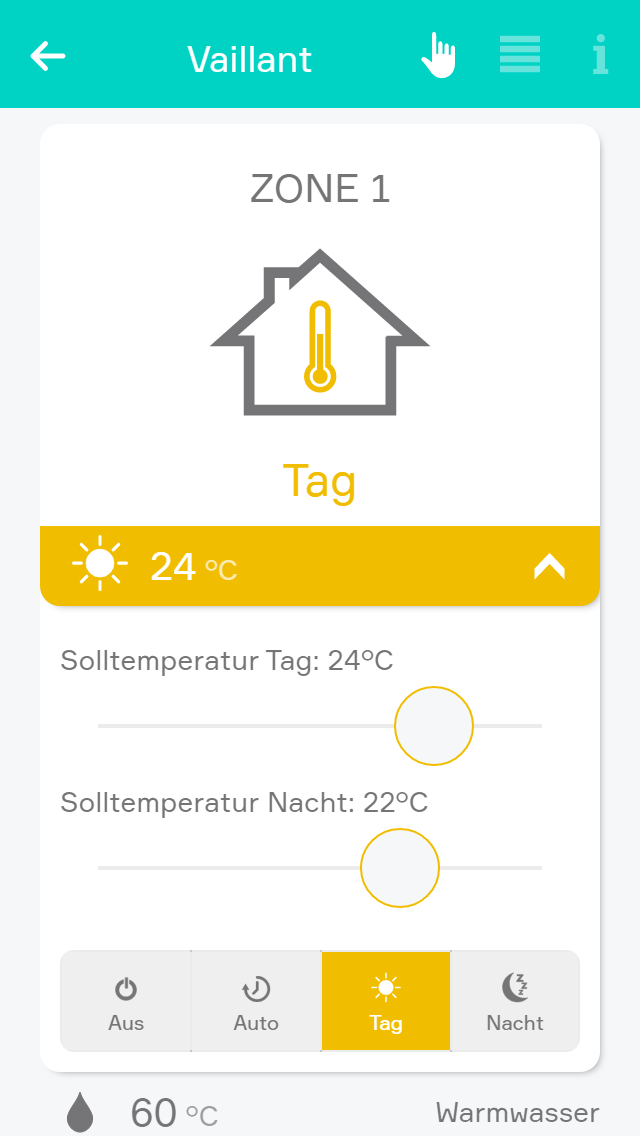 Pro Zone kann durch einen Klick auf die Zone der Sollwert für Tag und Nacht angepasst werden und der aktuelle Modus (Aus, Auto, Tag, Nacht) ausgewählt werden.