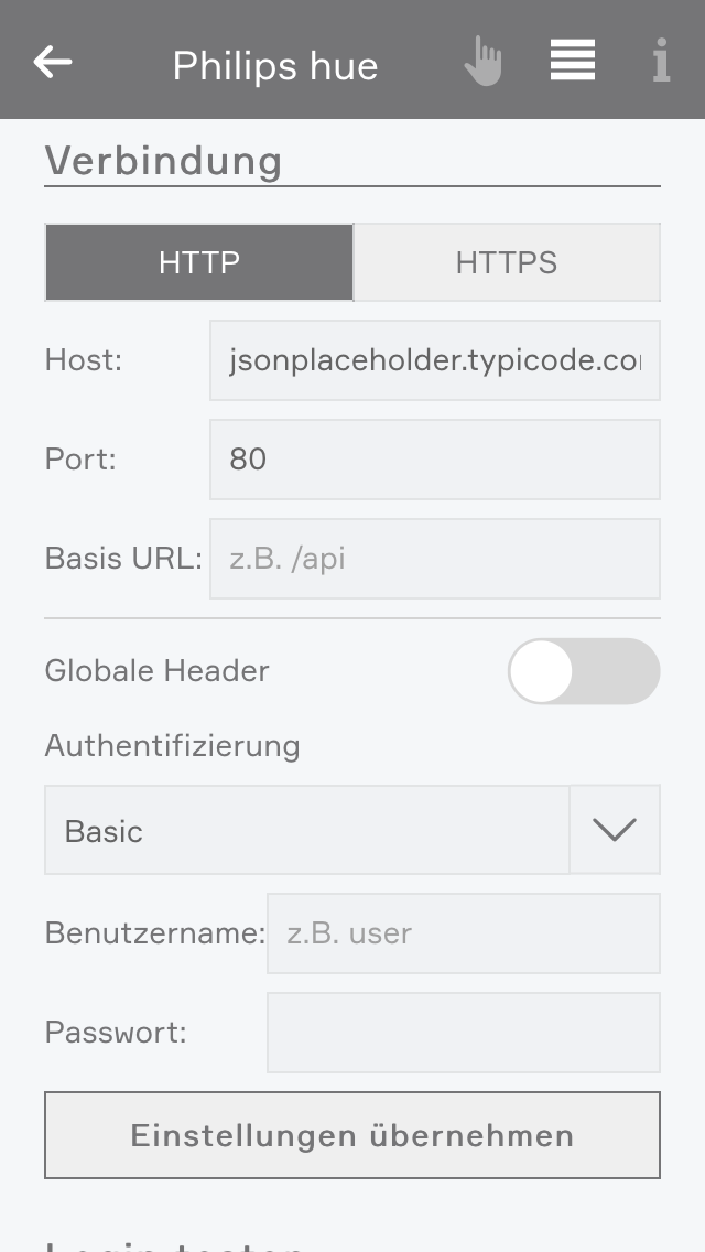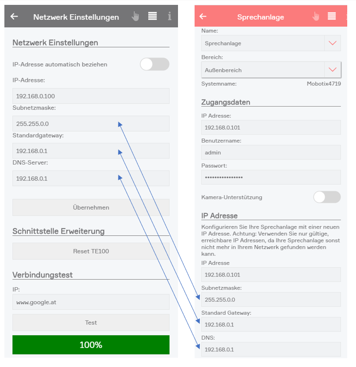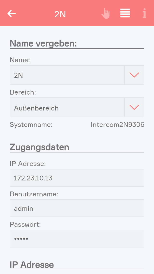 Wurde die Sprechanlage manuell von Ihnen angelegt, müssen Sie in die Einstellungen gehen und die IP Adresse eintragen. Nutzername und Passwort sind bereits ausgefüllt, können aber jederzeit geändert werden, falls Sie diese in der Türsprechanlage angepasst haben.
