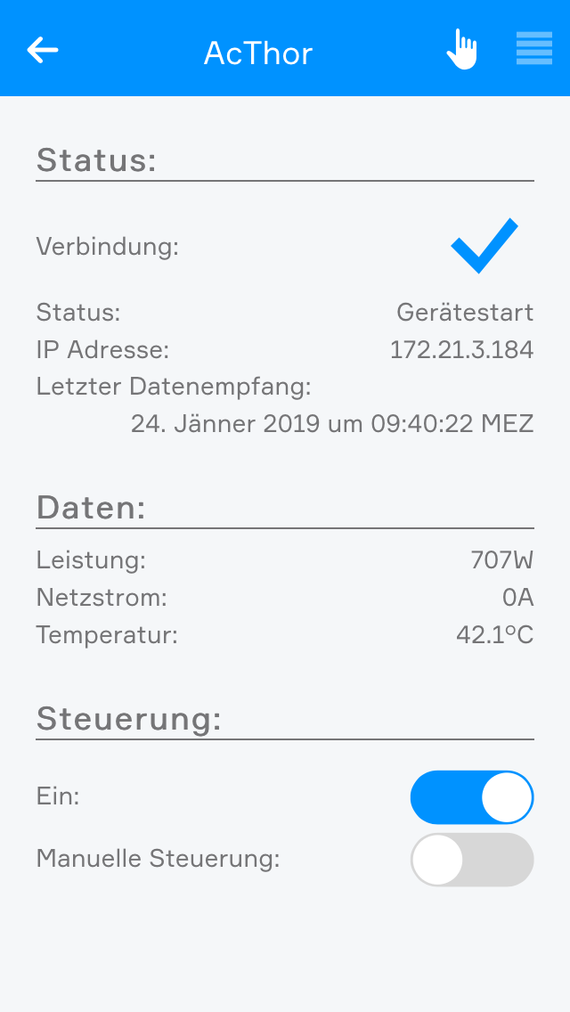 Unter "Status" ist der aktuelle Verbindungsstatus des Gerätes ersichtlich.