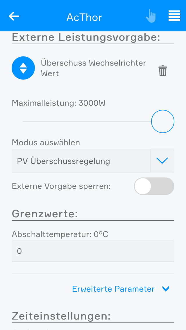 Unter "Einstellungen" kann die Solltemperatur für das Warmwasser angepasst werden und wenn mehrere Zonen vorhanden sind die Zone ausgewählt werden, welche für die Anzeige im Object Panel verwendet werden soll.