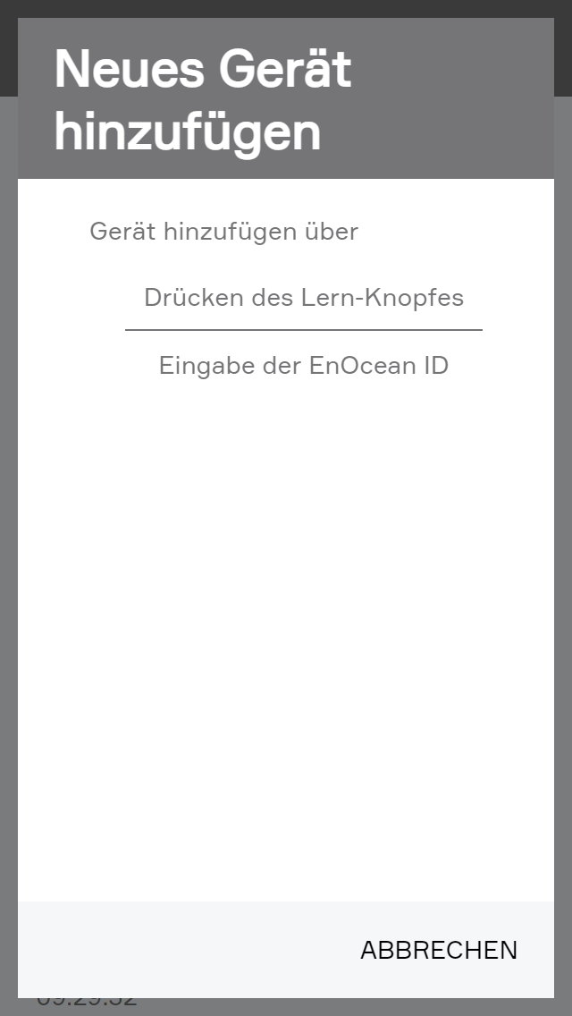Im nächsten Schritt müssen Sie auswählen, ob das Einlernen durch Drücken des Lern-Knopfes oder durch Eingabe der EnOcean ID erfolgen soll.