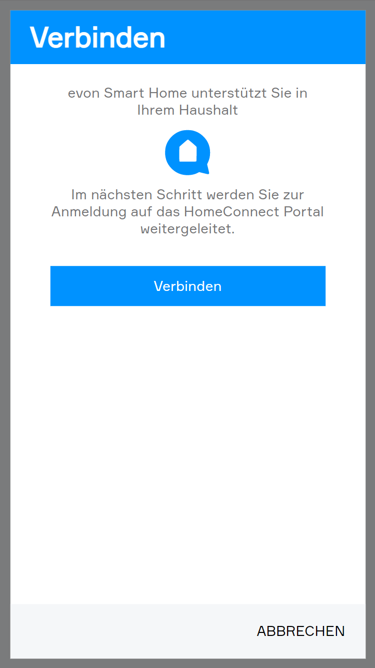 Nach dem Öffnen des Wizards, wird durch einen Klick auf "Verbinden" die Home Connect Website geöffnet, in der Sie sich mit Ihrem Home Connect Account anmelden können.